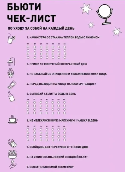 Чек-лист красоты Простите,мальчики, сегодня надо напомнить девочкам о любви к себе 🥰 Хотя часть рекомендаций и вам поможет улучшить жизнь 😌 БОНУС ДНЯ Канал с секретами красоты