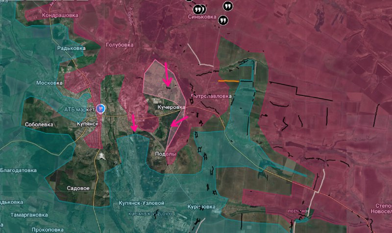 Купянск, примерная ситуация. И наши, и противник пытаются снова закрепиться в образовавшейся большой серой (килл) зоне.