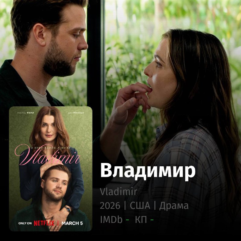 Владимир (2026, 1 сезон). Состоялся онлайн релиз сериала. 50-летняя преподавательница, профессор английского языка, увлекается загадочным молодым коллегой. Постепенно увлечение превращается в одержимо