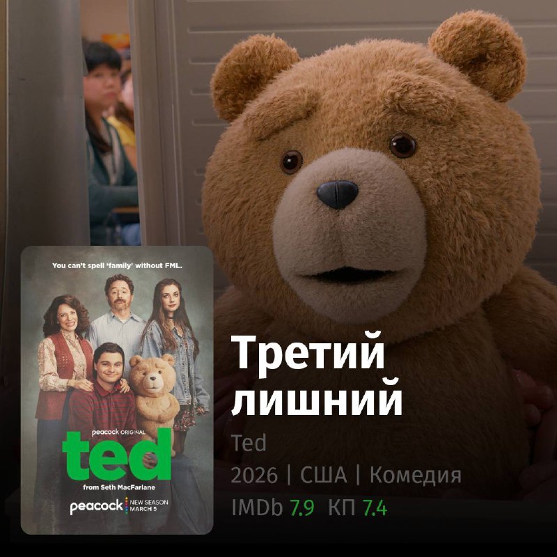 Третий лишний (2024, 2 сезон). На Peacock вышел второй сезон. 1993 год. Говорящий медведь Тед и его хозяин-подросток Джон Беннетт проводят время вместе в Массачусетсе, пока семья Джона пытается найти