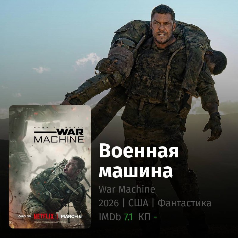 Военная машина (2026). На Netflix вышел фильм с Аланом Ричсоном. Во время последней изнурительной миссии на подготовке рейнджеров боевой инженер должен возглавить подразделение в схватке с гигантской