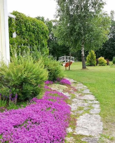 Если на участке живет тимьян, то пространство приобретает домашний уют, который создают пряный теплый запах тимьяна и плотный «ковер» его листочков и цветов. Он прекрасно сочетается с большинством рас