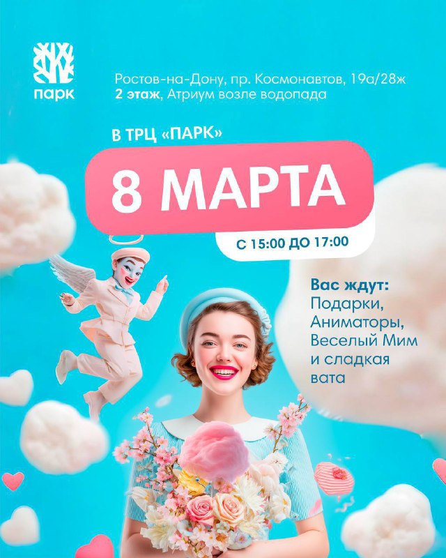 8 Марта вместе в Галерея Парк 🕖8 марта, 15:00-17:00 📍 пр. Космонавтов, 19а/28ж, на 2 этаже рядом с водопадом В программе праздника: 🎁 Подарки 🎭 Весёлые аниматоры 🤍 Очаровательный мим 🍭 Сладка