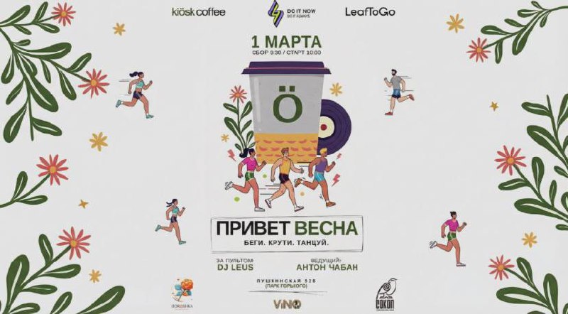 Утренний забег 🕖1 марта в 9:30 📍 Пушкинская 52В Kiosk Coffee На выбор две дистанции — 5 или 7 км. 🔸09:30 — сбор у Kiosk в парке Горького/ Пушкинская, 52В 🔸10:00 — старт 🔸11:00 — послезабежная