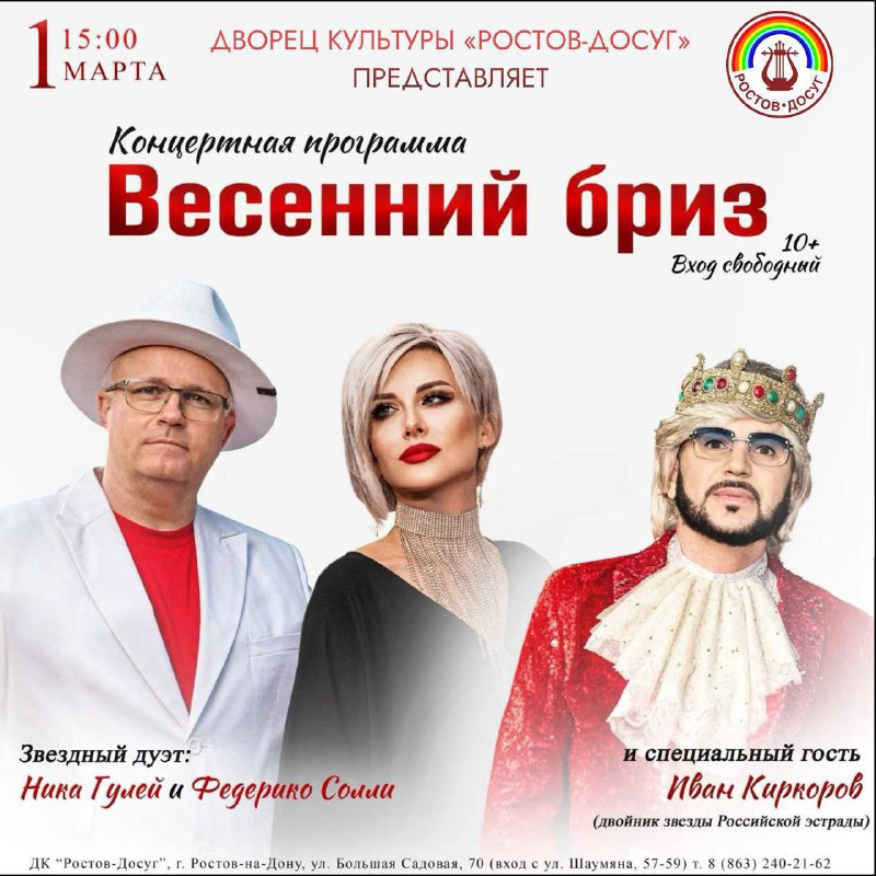 Концертная программа «Весенний бриз» 🕖1 марта в 15:00 📍 ул. Большая Садовая, 70 (вход с ул. Шаумяна, 57-59) Вы услышите песни в исполнении Ники Гулей, Федерико Солли и Ивана Киркорова ❗️Вход сво