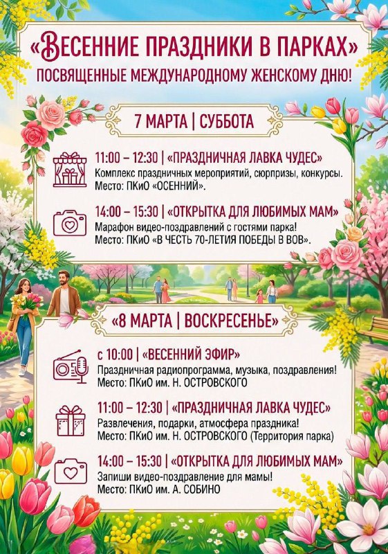 Мероприятия в парках 🕖7,8 марта 📍ПКиО им. Н. Островского 📍ПКиО "В честь 70-летия Победы в ВОВ 1941-1945гг" 📍ПКиО им. А. Собино 📍ПКиО «Осенний» В парках города пройдут мероприятия, посвященные