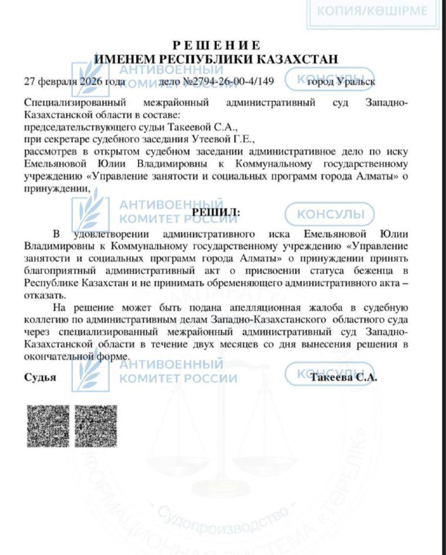 ❗️Казахстан отказал в политубежище разыскиваемой в РФ антивоенной активистке Юлии Емельяновой. Летом она была задержана в Казахстане при пересадке Отказ в предоставлении защиты бывшему члену штаба На