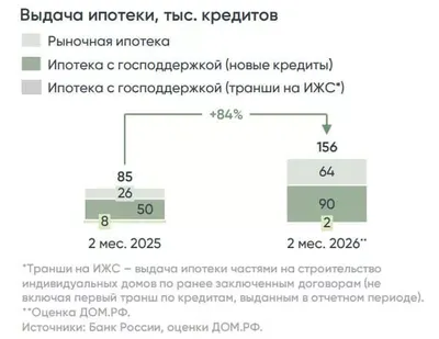 Выдача ипотеки в январе-феврале выросла на 84% по количеству (до 156 тысяч кредитов) и в два раза по объему (до ₽710 миллиардов) год к году, — «Дом РФ». Причем рост был вызван не только изменениями ус