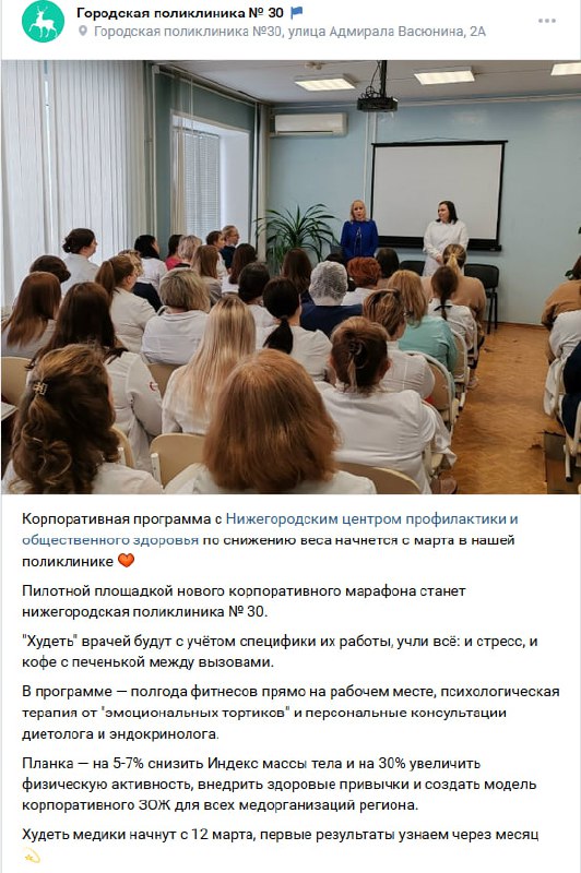 В нижегородской поликлинике запустили пилотный проект по похудению для медработников. В программе — фитнес и консультации диетолога. Предполагается снизить индекс массы тела на 5-7% и увеличить на 30