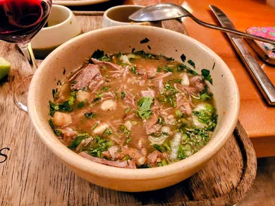 Интересное блюдо нашел в Мексиканском ресторане. Баранина барбакоа Баранина в бульоне с нутом, с гарниром из лука и кинзы, лаймом и соусом borracha («пьяная» сальса). Этакая мексиканская шурпа. Над