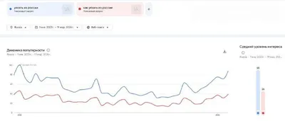 🚘 Россияне массово ищут способы уехать из страны Резкий рост запросов начался сразу после начала блокировок и массовых отключений интернета. Индекс достиг 88 баллов, что близко к рекорду 100 баллов