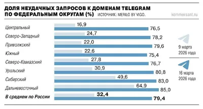 Коммерсант: Telegram заблокирован на 80% В отдельных федеральных округах этот показатель близится к 90%