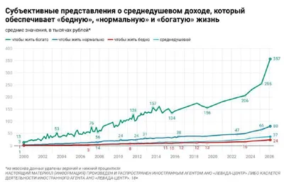 Россияне повысили «порог богатства» до 357 000₽ (+40% за год) При этом за тот же период сократилась доля людей с доходами выше прожиточного минимума: с 48% до 41%.
