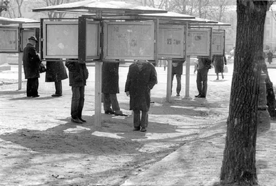 🖇Москвичи читают свежую прессу 🔵В советской Москве газеты выходили дважды в день (утром и вечером). Их разносили по почтовым ящикам, а также регулярно вывешивали на газетные стенды, расположенные в