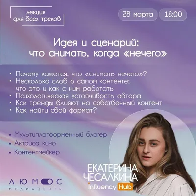 Медиашкола «Люмос» приглашает на лекцию к Екатерине Чесалкиной — блогеру агентства Influency Hub. За ее плечами огромный опыт и 50 миллионов просмотров на разных площадках!❤️ ➡️Участники узнают, как