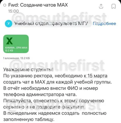 В МГУ обязали всех начать использовать MAX На химическом факультете МГУ студентам пришло объявление о необходимости создать чат каждой учебной группы в российском мессенджере MAX. В письме указываетс