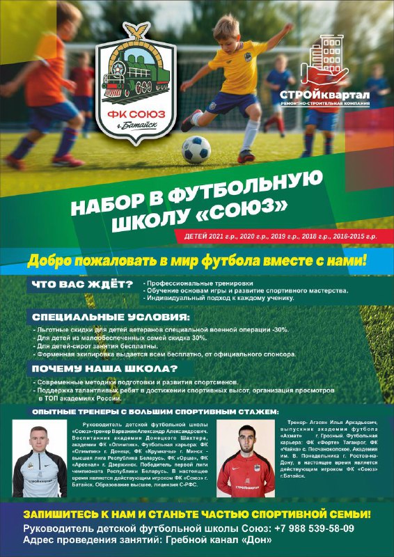 ⚽️ ОТКРЫТ НАБОР В ФУТБОЛЬНУЮ ШКОЛУ «СОЮЗ» Приглашаем в детскую футбольную школу ФК «СОЮЗ» на регулярные тренировки и обучение основам футбола. 📌 Набор детей: 2015–2016 г.р. 2018 г.р. 2019 г.р. 2020