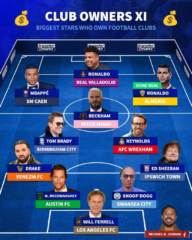 🇵🇹Сборная звездных владельцев Криштиану Роналду недавно купил 25% акций испанской «Альмерии». И теперь вошел в число звездных совладельцев клубов! Transfermarkt по этому поводу составил символичес