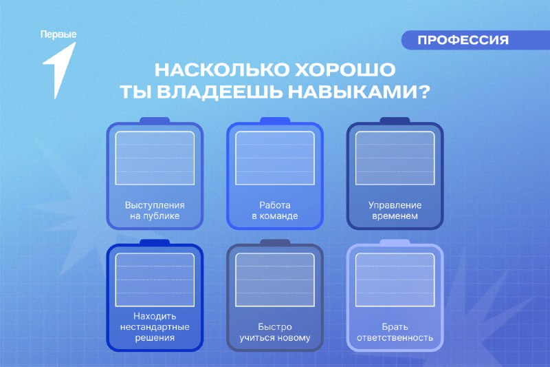 🔋 Расскажи о своих навыках без слов — заполни батарейки! Какие заполнены полностью или требуют подзарядки знаниями? Скачивай карточку Движения Первых, отмечай в каждой батарейке на столько процентов