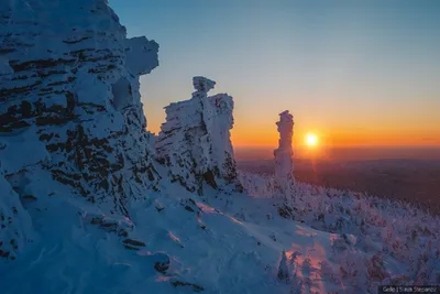 Помянённый камень зимой. Это место находится на севере Пермского края, возле города Красновишерск, в 350 км от Перми. Гору называют Помянённым или Колчимским камнем. Хребет с причудливыми каменным