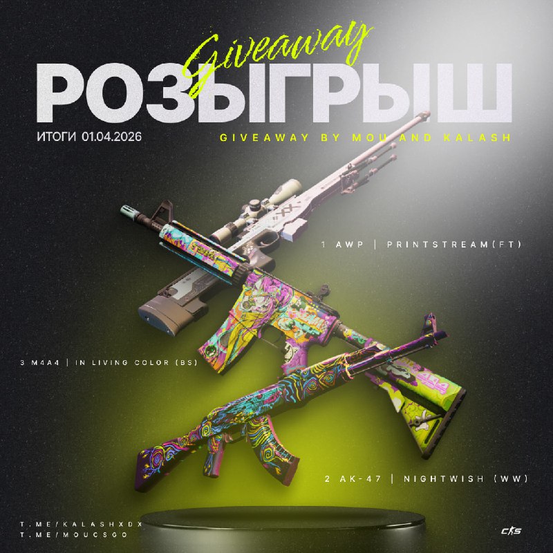 РОЗЫГРЫШ СКИНОВ mou x kAlash. — AWP | Printstream ( FT ) — AK-47 | Nightwish ( WW ) — M4A4 | In Living Color ( BS ) Условия очень просты: 1. Подписка на tg mou 2. Подписка на tg kAlash 3. Постави