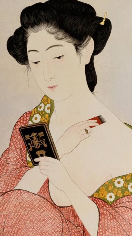 Посмотрите на эту сцену. Женщина слегка поправляет ворот кимоно и смотрит в маленькое карманное зеркало. Такие зеркала часто хранились в лаковых футлярах и считались очень личной вещью. Их носили с
