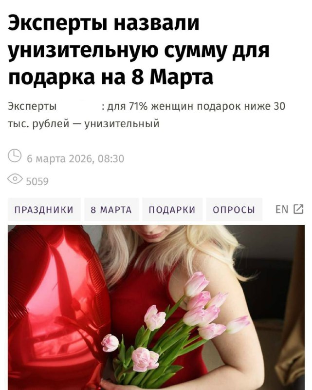 Подарок на 8 Марта дешевле 30,000 рублей — унизительный, считают опрошенные женщины старше 18 лет. Самые желанные подарки: деньги (65%), новая сумочка (61%) и ювелирные украшения (53%). Самый худший