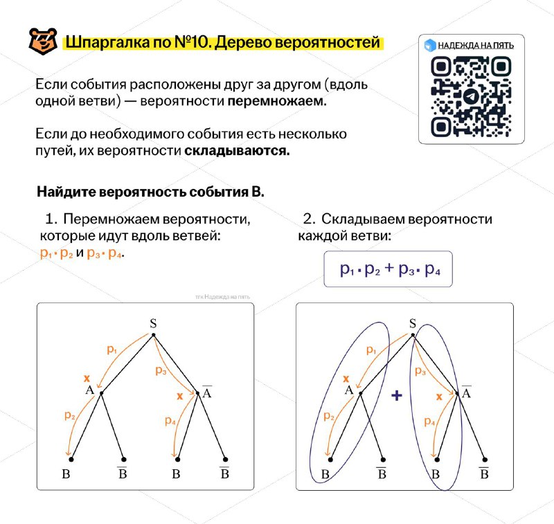 ✌ Ловите шпаргалку по задачам на дерево вероятностей в банке ФИПИ во всех задачах просят найти вероятность события В. Тогда все эти задачи решаются одинаково по итоговой формуле: p₁‧p₂ + p₃‧p₄ тут р