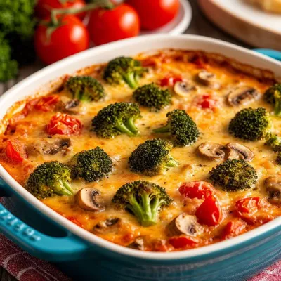 Запеканка овощная 📖 Ингредиенты: - Молоко - 150 мл. - Яйца - 6 шт. - Брокколи - 100 г. - Помидоры Черри - 100 г. - Цветная капуста - 100 г. - Шампиньоны - 150 г. - Стручковая фасоль - 1 ст.