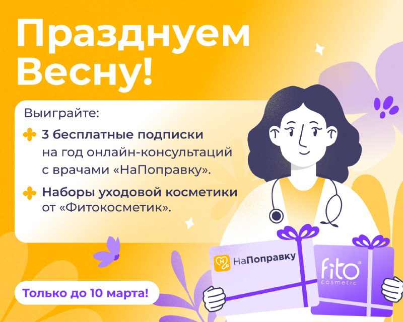 💐Весна – время подарков! Выиграйте 3 бесплатные подписки на год онлайн-консультаций с врачами «НаПоправку» и большой набор уходовой косметики* от «Фитокосметик»: маски, патчи, сыворотки и не только!