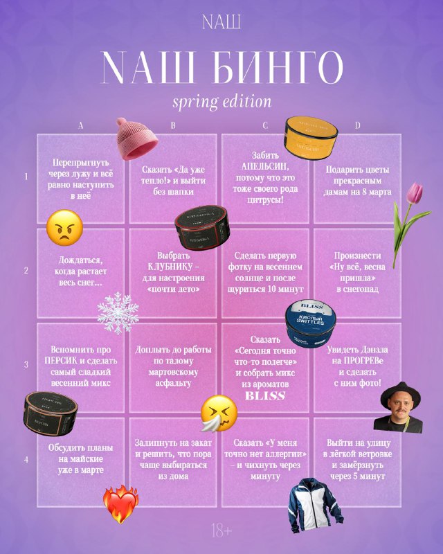 Весеннее бинго 🌤 Первая неделя весны уже вовсю идёт — пусть погода пока и не спешит радовать. Но мы-то знаем: сезон уже стартовал! Давай проверим, что ты успел отметить в своём весеннем списке? А за