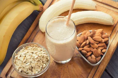 Делаем простое и полезное смузи с ребенком🥤 Ингредиенты на 2 порции: молоко – 200 мл банан – 1 шт. овсяные хлопья – 60 г корица – 3 г сахар – 10 г Измельчаем хлопья, добавляем остальные ингредиент