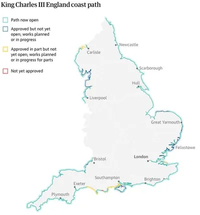 В Англии открыли самую длинную в мире прибрежную пешеходную тропу King CharlesIII England Coast Path. Ее протяженность 4327 км. Большая часть маршрута уже существовала, но сейчас ее обновили и добавил