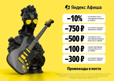 Актуальные скидки на Яндекс Афише по промокодам: ✔️ AI813034 — Скидка 500₽ на первую и все повторные покупки билетов от 3000₽; ✔️ AS994461 — Скидка 10% на первую и все повторные покупки билетов от 30