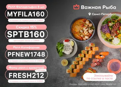 Актуальные промокоды в Важной Рыбе 🍣 PFNEW1748 – Ролл Калифорния в подарок при каждом заказе от 3 999 ₽ 🍣 SPTB160 – Скидка 15% при каждом заказе от 3 999 ₽ 🍣 FRESH212 – Фреш ролл с креветкой и ав