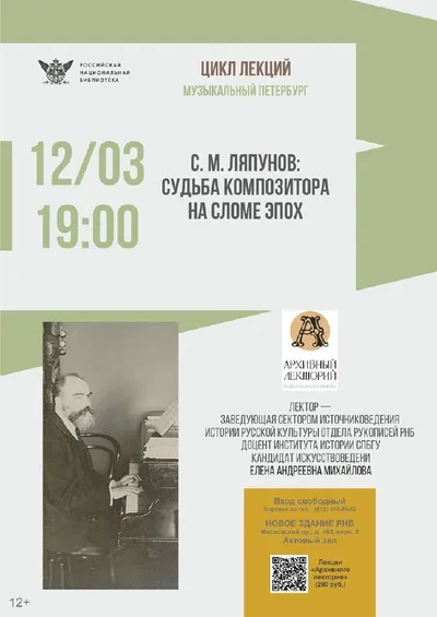 ⚡️Сегодня в 19.00. в Новом здании (Московский пр. 165 корп. 2) состоится лекция проекта «Архивный лекторий» — «С. М. Ляпунов: судьба композитора на сломе эпох». Сергей Михайлович Ляпунов (1859–192
