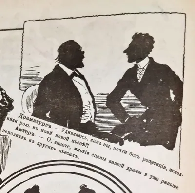 Драматург: — Удивляюсь, как вы, почти без репетиций, исполнили роль в моей новой пьесе?! Актер: — О, знаете, многие сцены вашей драмы я уже раньше исполнял в других пьесах. Журнал «Будильник», 1894