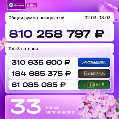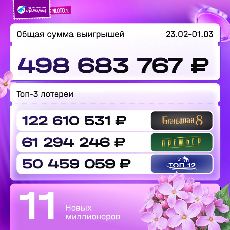 🌸 Начинаем весну с отличных новостей — и, конечно, с побед! За прошедшую неделю участники «Национальной Лотереи» выиграли 498 683 767 рублей. Особенно им везло в «Большой 8», «Премьер» и «Топ 12» —