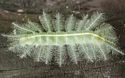 Боярышниковый пилилщик (Trichiosoma tibiale). Тело гусеницы светло-зеленое, с характерной оранжево-красной головой. Эти личинки часто встречаются на боярышнике, питаясь его листьями. В отличие от наст