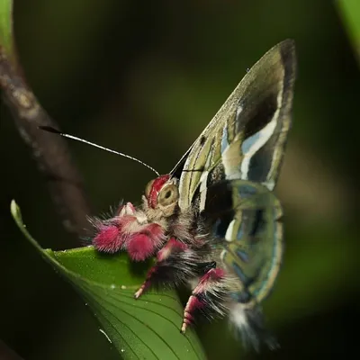 Бабочка Anteros renaldus из семейства риодинид, как и её родственники, отличается светлыми отметинами на нижней стороне крыльев и роскошными мохнатыми ножками.
