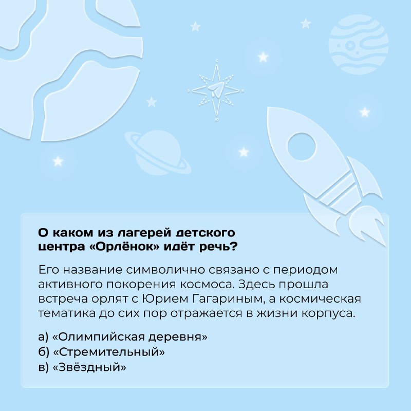 Сможешь отгадать лагерь «Орлёнка», который мы загадали? Он открыл свои двери 15 июня 1964 года. Туда приезжают увлечённые космосом и техническим творчеством ребята, спортсмены, лидеры, победители вс