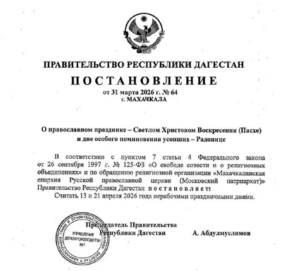 В Дагестане 13 и 21 апреля объявили выходными днями в честь православных праздников Пасхи и Радоницы — соответствующее постановление приняло правительство республики. Вот это многонациональненько! В