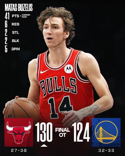 Матас Бузелис в матче «Чикаго» - «Голден Стэйт»: 41 очко (Лучший показатель за карьеру) 6 подборов 2 передачи 2 перехвата 2 блока 16-28 FG 5-15 3PT 4-5 FT 45:12 игрового времени NBA. NEWS | #NBA