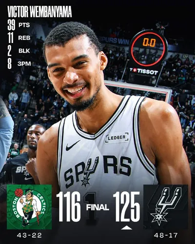 Виктор Вембаньяма в матче «Сан-Антонио» - «Бостон»: 39 очков 11 подборов 3 передачи 1 перехват 2 блока 11-20 FG 8-15 3PT 9-12 FT 36:34 игрового времени NBA. NEWS | #NBA