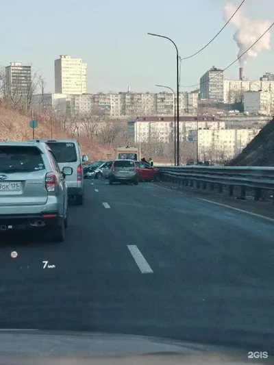В районе бухты Тихой на объездной по направлению в сторону Седанки автомобиль Mitsubishi Mirage не справился с управлением и совершил столкновение с леерным ограждением. Двигавшаяся следом Toyota Aqu