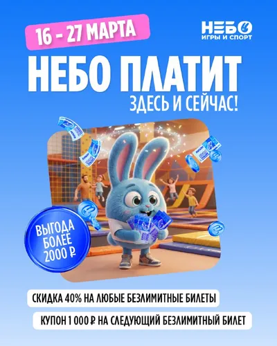 Не, ну если Небо платит, то чего бы и не побежать, да?😅 ✏️ До 27 марта приходи развлекаться и активно проводить время в центры Небо Крымская, Бутово и Марьино и покупай входные билеты со скидкой 40%