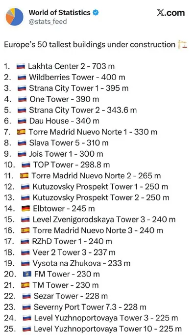 4 из 5 строящихся в Европе небоскребов возводятся в России. При этом топ-5 самых высоких из них полностью состоит из российских проектов. Возглавляет его «Лахта-центр» с рекордной высотой в 703 метра.