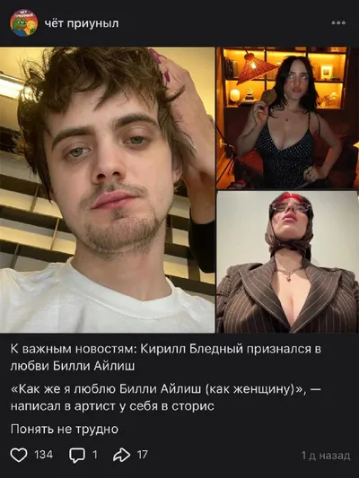 Зашел в вк🤡 Действительно, очень важные новости. Кирилл, ну тебе в любом случае удачи, Билли Айлиш - птичка высокого полета!