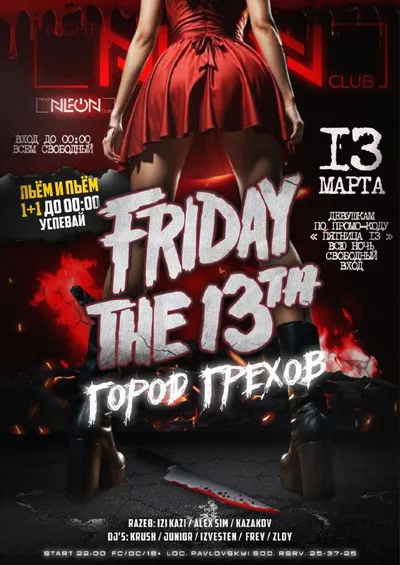 👋👋👋👋👋👋👋 ❗️ В ЭТИ ВЫХОДНЫЕ ❗️ NEON CLUB 🔝🏎 13 и 14 МАРТА ⚠️ПЯТНИЦА 13😁 ГОРОD ГРЕХОВ ⚠️ ЛЬЁМ и ПЬЁМ 🅰️🅰️🅰️ ДО 00:00 + ВСЕМ ВХОД СВОБОДНЫЙ ПО ПРОМО-КОДУ "ПЯТНИЦА" ‼️ДЕВОЧКАМ ВСЮ НОЧЬ ВХО