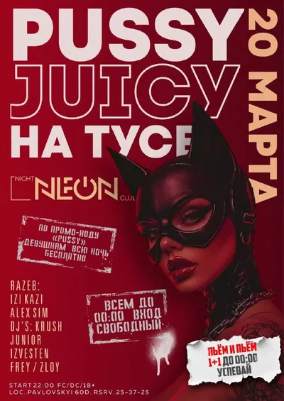 😁😁😁😁😁😁😁 ❗️ В ЭТИ ВЫХОДНЫЕ ❗️ NEON CLUB ⚡20 и 21 МАРТА ⚠️ПЯТНИЦА 😘 PUSSY JUICY на ТУСЕ 🆓ВСЕМ ДО 00:00 ВХОД СВОБОДНЫЙ 👍ДЕВОЧКАМ ВСЮ НОЧЬ ВХОД БЕСПЛАТНЫЙ ПО ПРОМО-КОДУ "PUSSY" ⚠️СУББОТА